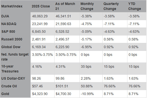 March unfolded as a month marked by geopolitical tensions, inflation anxiety, and a continued shift in investor preferences. The economy remained relatively stable in March, even as the markets reacted sharply to external influences, particularly the escalating conflict involving Iran. Despite a bump at the end of the month after the Iranian president indicated an openness to ending the war, the major indexes closed below their February ending values.