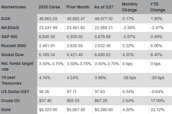 The U.S. stock market ended the month on a rather sour note, with both the S&P 500 and the NASDAQ closing February in the red, while the Dow managed to just edge into the black. After a strong start in January, the tech rally cooled, as investors grew concerned about market concentration. Tech stocks tumbled, while defensive and cyclical stocks trended higher. Mega-cap stocks, which carried the market throughout 2025, saw increased volatility in 2026. Investors questioned big-tech valuations, seizing an opportunity to take profits. In February, money moved to value stocks, such as energy, materials, and consumer staples.
